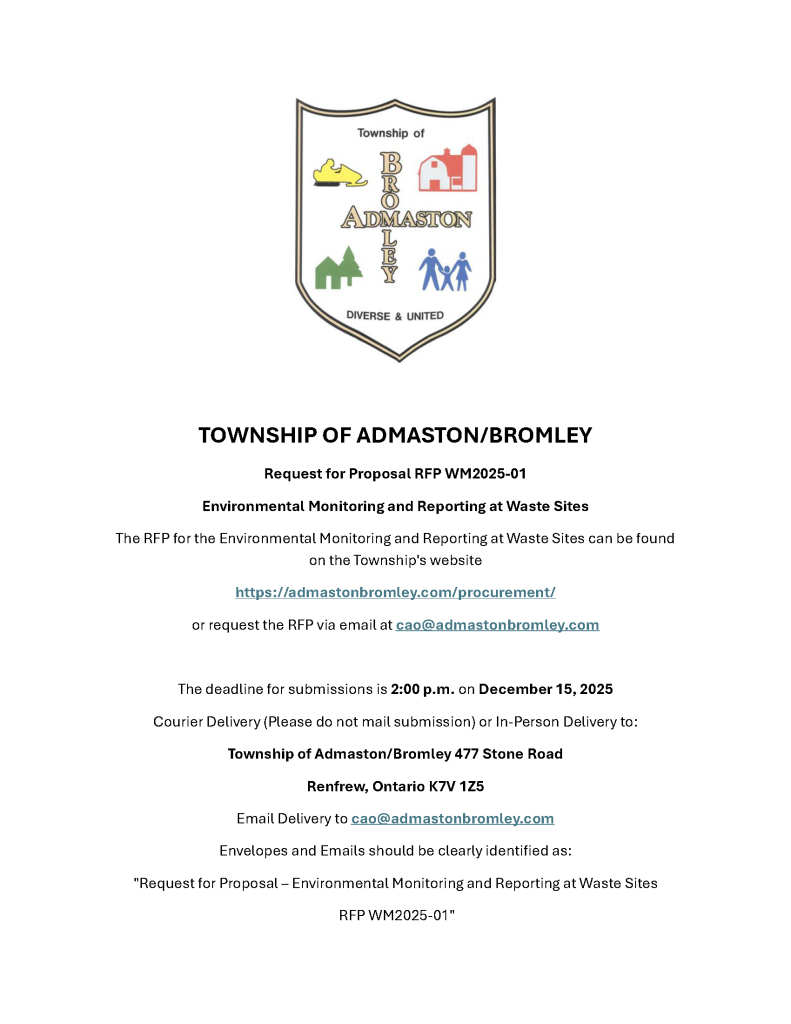 The Township of Admaston/Bromley intends to participate in one or more procurements conducted by Local Authority Services (LAS) between August 2025 to August 2026. For further information and access to LAS request for proposal (RFP) notices, please review the website at www.las.on.ca.